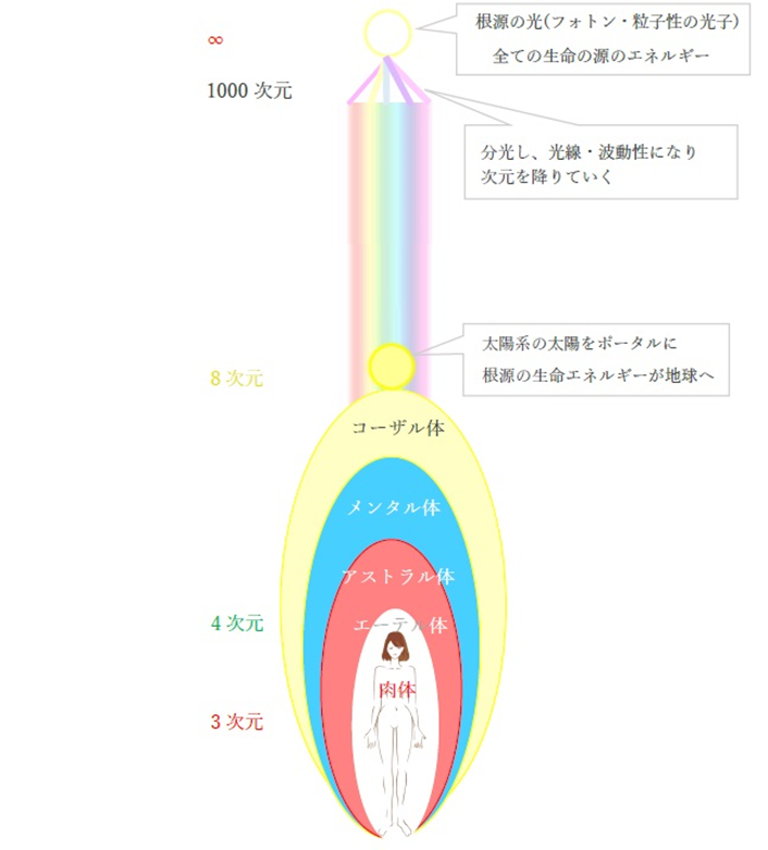 コーザル体、メンタル体、アストラル体、エーテル体を経て、